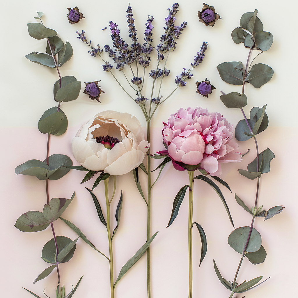 $ A meticulously composed high-resolution photorealistic botanical flat lay of diverse flowers. Centrally features a lush pale pink peony and a deeper magenta-pink peony, both with fully bloomed heads on long stems. Above them, a delicate light lavender-purple scabiosa flower with a visible dark center. Multiple clusters of dried lavender with dark purple buds flank the peonies. Numerous scattered loose matte green eucalyptus leaves and small eucalyptus branches create a balanced frame. The background is a clean, minimalist ultra-pale pastel cream-pink color. Soft, natural, diffused studio light. Macro details of textures. Vertically aligned stems. --no clutter --v 6.0