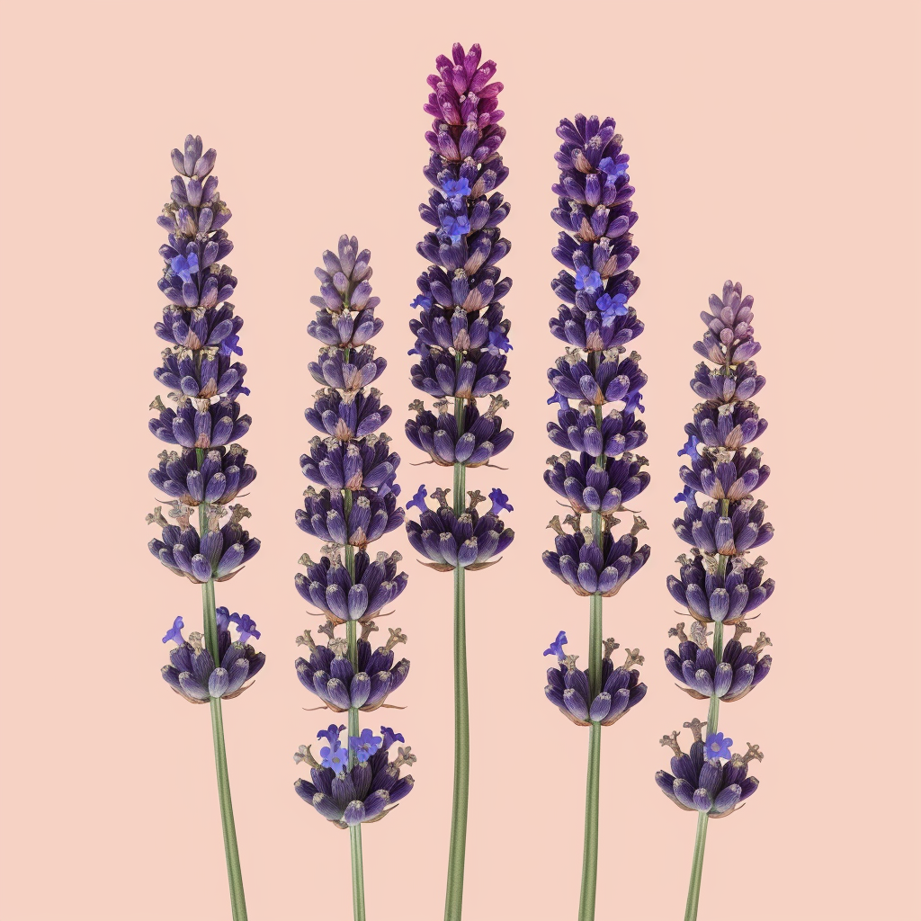 $ A highly detailed, photorealistic botanical photograph of a collection of multiple (approximately eight) distinct, vertical lavender flower stalks, arranged in a free-standing, staggered cluster, identical to the composition in image_14.png. Primary stalks feature dense, tightly clustered, rich deep purple and lavender-blue florets on slender green stems. A central, unique stalk is distinctive with a cluster of unusually bright magenta-pink florets at its very apex, contrasting with the lower lavender-blue florets. The stalk far right features dense purple buds and florets, with smaller stalks to its left. Each flower spike and calyx is rendered with intricate, realistic petal and surface textures. The entire cluster is completely isolated on a solid, clean, extremely pale, warm peachy-white background, matching the isolation and background pattern from previous examples (like image_11.png and image_12.png). Flat, even, soft studio diffused lighting, illuminating the vertical arrangement with no harsh shadows or highlights, emphasizing petal and calyx translucency. Crystal clear, edge-to-edge sharp focus across all stalks, all florets, buds, stems, and small leaf details at the bases. Crystalline clarity across the entire clustered object. Pristine botanical photography, high-end macro details, 8k resolution, ultra-realistic --no gloss, shine, reflections, plastic, metallic, glare, floor reflections, surface shadows, abstract forms, distorted shape, motion blur, blur, depth of field, bokeh, vase, pot, dirt, background shadows, environment, leaves, paper texture, glass, metallic base, abstract art, water drops, insects, other flowers, out-of-focus elements, artificial elements, low resolution, noise, artifacts --style raw --v 6.0 --ar 1:1 --stylize 100