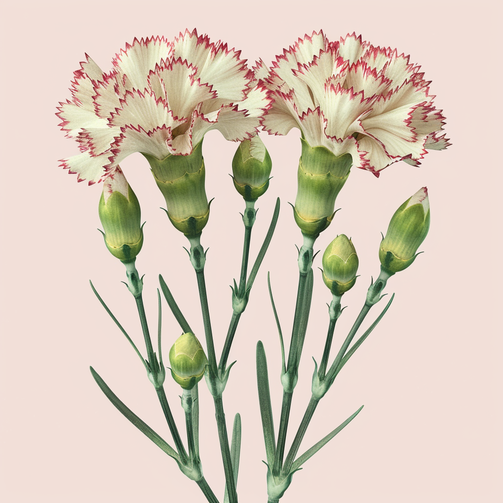 $ A highly detailed, photorealistic botanical photograph of multiple stems of miniature carnations, identical in composition, variety, and positioning to image_20.png. The scene features two fully open, textured bi-color miniature carnation blooms on long, thin, branching green stems. The blooms have pale creamy-pink bases with sharp, fringed deep crimson-magenta edges. Also present are seven closed green buds, one prominent partly open creamy-pink bud with a visible central stripe, and multiple long, slender, pointed green leaves, exactly as arranged in image_20.png. Every single petal, bud, leaf, stem, and all the intricate, textured ruffles and the specific color markings are rendered with intricate, realistic clarity and sharp focus. The entire complex object of multiple stems, flowers, and leaves is completely isolated on a solid, clean, extremely pale, cool pinkish-white background, matching the background tone from previous examples like image_11.png and image_12.png. Flat, even, soft studio diffused lighting illuminates the entire arrangement with no harsh shadows or highlights, emphasizing petal translucency and texture. Crystal clear, edge-to-edge sharp focus across all elements: all blooms, all petals, all stems, all leaves, and every single bud. Crystalline clarity across the entire radiating object. Pristine botanical photography, high-end macro details, 8k resolution, ultra-realistic --no gloss, shine, reflections, plastic, metallic, glare, floor reflections, surface shadows, abstract forms, distorted shape, motion blur, blur, depth of field, bokeh, vase, pot, dirt, background shadows, environment, leaves outside the specific elements, paper texture, glass, metallic base, abstract art, water drops, insect, other flower types not listed, out-of-focus elements, artificial elements, low resolution, noise, artifacts --style raw --v 6.0 --ar 1:1 --stylize 100