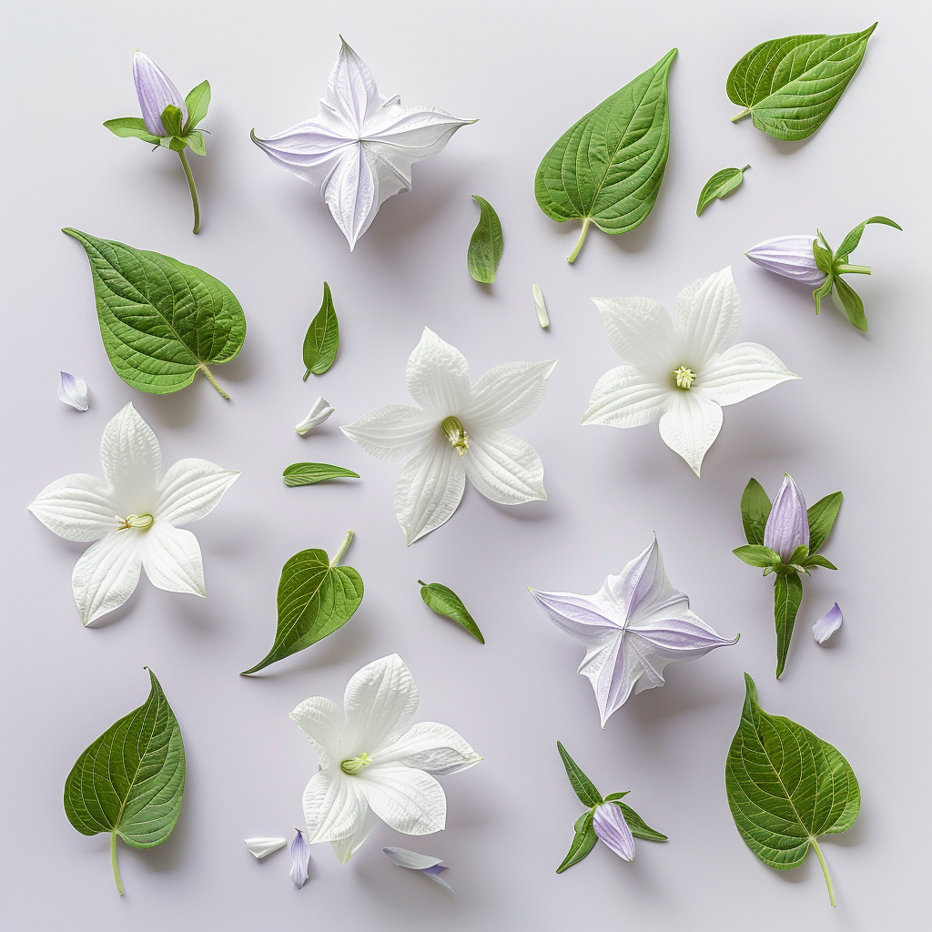 $ High-resolution, photorealistic studio flat-lay photograph of isolated Platycodon grandiflorus (balloon flower) blooms and various green leaves floating on a clean, solid, pale off-white background with a delicate pinkish-lavender cast. The composition is an organic, balanced pattern of individual flower heads and leaves, replicating the exact arrangement of image_3.png. Four flowers are oriented face-up, revealing their soft white petals with intricate, distinct dark purple veining and light yellow central stamens and pistils. Three flowers are shown from the side or back, displaying green calyxes and closed petals. Interspersed among the flowers are numerous individual green leaves of varying sizes and shapes, including serrated ovate leaves and smaller, smoother ovate or oblong leaves. All elements are sharply in focus, with a soft, even studio lighting that highlights textures. The background is isolated and pure. --ar 1:1 --style raw --v 6.0