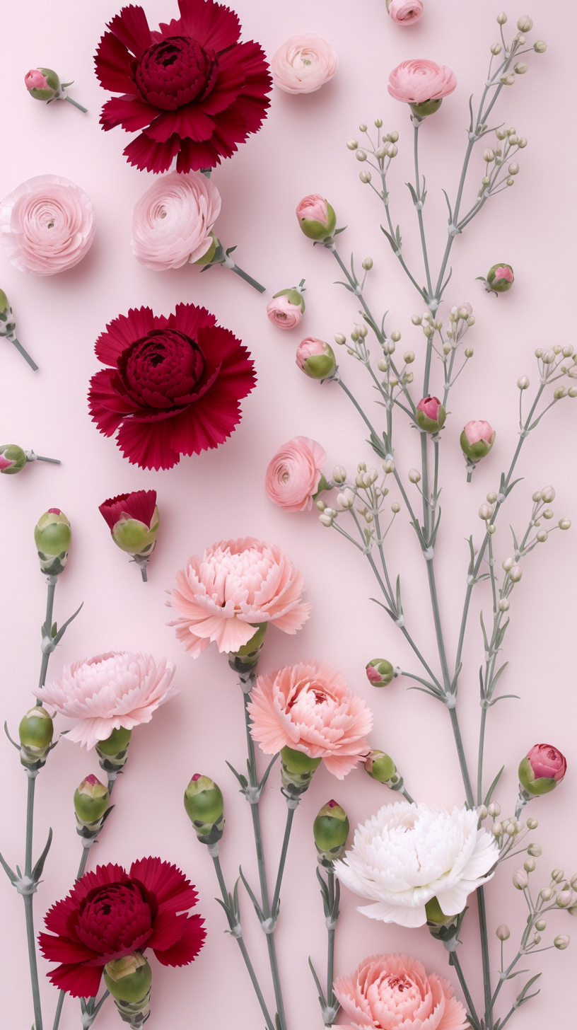 $ A highly detailed, photorealistic botanical photograph, pristinely expanded to an elongated vertical panel. The composition is an continuous, all-over pattern of scattered flower blooms, precisely replicating the element variety and scattered arrangement of image_27.png but populating a much longer frame. Features include numerous rich, velvety fully open carnation blooms (Dianthus) in crimson-red, deep pink, and soft pink. A greater abundance of layered ranunculus blooms with their complex petal structures, showcasing colors of soft blush pink with yellow cores, and creamy petals with magenta-pink margins. Multiple sprays of delicate lisianthus (Eustoma) blooms in pink and white shades on fine stems. A wider array of rose-like and small double-floret blooms in pale white and pink tones. Countless tiny, intricate scattered buds and florets on delicate green stems, populating the extended pattern. The entire collection of flowers is completely isolated on a solid, clean, extremely pale, cool pinkish-white background, matching the background tone from image_27.png. Flat, even, soft studio diffused lighting illuminates the expanded cascading arrangement with no harsh shadows or highlights. Crystal clear, edge-to-edge sharp focus across all elements. Pristine botanical photography, high-end macro details, 8k resolution, ultra-realistic --no gloss, shine, reflections, plastic, metallic, glare, floor reflections, surface shadows, abstract forms, distorted shape, motion blur, blur, depth of field, bokeh, vase, pot, dirt, background shadows, environment, leaves outside the specific elements, paper texture, glass, metallic base, abstract art, water drops, insect, other flower types not listed, out-of-focus elements, artificial elements, low resolution, noise, artifacts --style raw --v 6.0 --ar 9:16 --stylize 100
