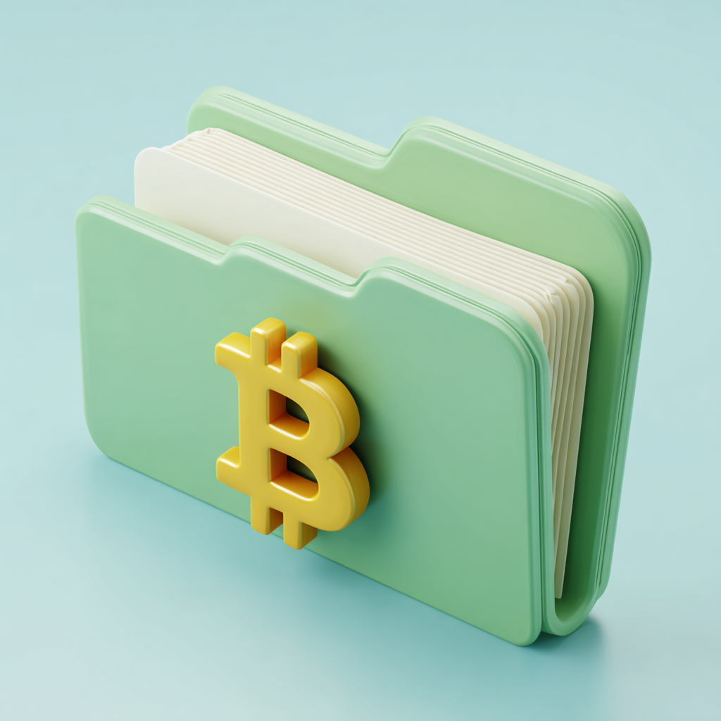 $ # A detailed, high-resolution 3D render icon of an open green file folder made of smooth, soft-touch plastic with rounded edges. The folder is angled in an isometric perspective. Several clean white sheets of paper are inserted and tilted to the side, extending from the top. A prominent, warm golden-yellow 3D Bitcoin symbol (₿) is affixed to the front flap of the folder. Studio lighting creates soft, realistic shadows. The background is a clean, uniform pastel light blue, matching the aesthetic of image_0.png. High quality, photorealistic, 8k, minimalist, clean design