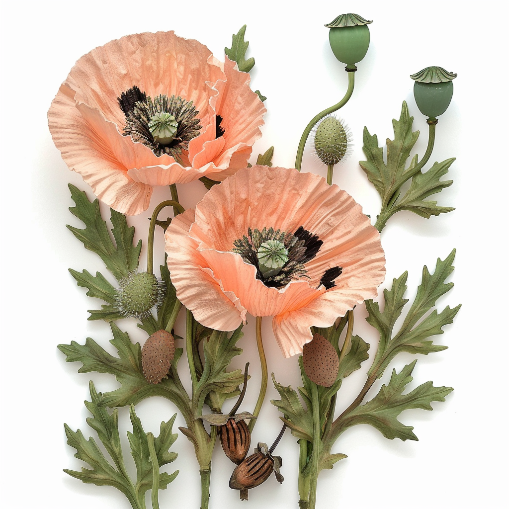 $ A highly detailed, photorealistic botanical photograph of a detailed composition of several peach-pink poppy plants, arranged exactly as in image_0.png. The scene features exactly three distinct, fully open poppy blooms: one left-facing in profile, one central frontal, and one right-facing frontal. All blooms have delicate, crinkled, soft apricot-peach colored petals, each with a dark black center of stamens and a green seed pod, visible in the two frontal blooms. The composition includes one large, drooping green hairy bud at the top center; three smaller green buds on slender stems; and two dried brown poppy seed pods. The arrangement has slender, finely hairy green stems and several sharply-toothed basal green leaves at the bottom. The entire composition is completely isolated on a clean, solid, ultra-pale, neutral white background, matching the isolation from image_0.png. Even, soft studio diffused lighting, illuminating the complex arrangement with no harsh shadows or highlights. Crystal clear, edge-to-edge sharp focus across all elements. Crystalline clarity across the entire plant system. High-end macro details, 8k resolution, ultra-realistic --no gloss, shine, reflections, plastic, metallic, glare, floor reflections, surface shadows, abstract forms, distorted shape, motion blur, blur, depth of field, bokeh, vase, pot, dirt, background shadows, environment, any paper texture, glass, artificial elements, low resolution, noise, artifacts, other flower types, water drops, insects --style raw --v 6.0 --ar 1:1 --stylize 100