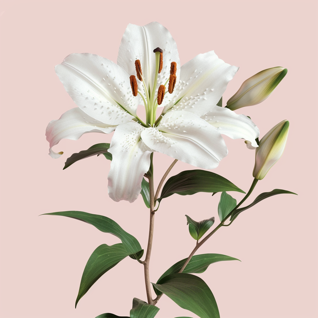 $ A highly detailed, photorealistic branching stem of white Oriental lilies, isolated on a solid, clean, very pale, cool pinkish-white background, matching the isolation. The main central open bloom has pristine white petals with subtle natural veining, showcasing the intricate, curved petal structure and prominent, detailed brown-orange anthers and pistil. To the right on the same branch are a smaller lily bud and a semi-open bloom. The leaves are smooth, vibrant green with visible realistic texture. The branching composition is identical. Flat, even, soft studio diffused lighting, eliminating harsh shadows and highlighting petal translucency. Crystal clear, sharp focus from front to back, edge-to-edge across all petals, stamens, and leaves. Crystalline clarity across the entire branching object. High-end botanical photography, macro details, 8k resolution, ultra-realistic --no gloss, shine, reflections, plastic, metallic, glare, floor reflections, surface shadows, abstract forms, distorted shape, motion blur, blur, depth of field, bokeh, vase, pot, dirt, background shadows, environment, large leaves, paper texture --style raw --v 6.0 --ar 1:1 --stylize 100