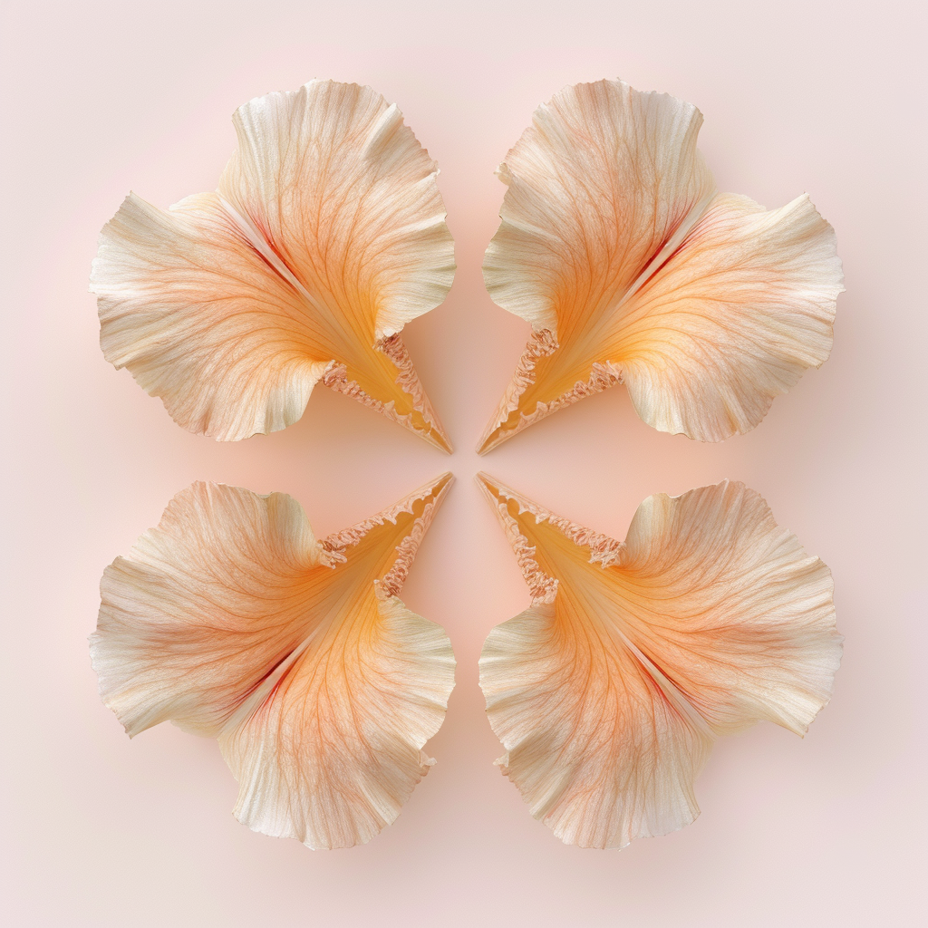$ A highly detailed, photorealistic botanical photograph of exactly four distinct flower petals, precisely arranged in a cross-shaped pattern with a central void, identical to the positioning in image_2.png. Two petals in the upper quadrant and two petals in the lower quadrant, each pointing outwards to form a precise, symmetrical radial pattern. Each petal exhibits a flawless gradient from a rich, golden-yellow base to a soft, creamy-pale pinkish-white edge, identical to the coloring in image_2.png. Every single petal is rendered with intricate, realistic petal textures and a distinct, complex radial veining pattern that splits and travels towards the petal margins. The entire composite object of four petals is completely isolated on a solid, clean, extremely pale, cool pinkish-white background, matching the isolation and background pattern from image_2.png. Flat, even, soft studio diffused lighting, illuminating the radial arrangement with no harsh shadows or highlights, emphasizing intricate texture. Crystal clear, edge-to-edge sharp focus across all four petals, all veining, and all textures. Crystalline clarity across the entire radiating object. Pristine botanical photography, high-end macro details, 8k resolution, ultra-realistic --no whole flower, stem, leaves, flower, vase, pot, dirt, background shadows, surface shadows, abstract forms, distorted shape, motion blur, blur, depth of field, bokeh, gloss, shine, reflections, plastic, metallic, glare, floor reflections, paper texture, glass, metallic base, abstract art, water drops, insect, other flowers, out-of-focus elements, artificial elements, low resolution, noise, artifacts --style raw --v 6.0 --ar 1:1 --stylize 100
