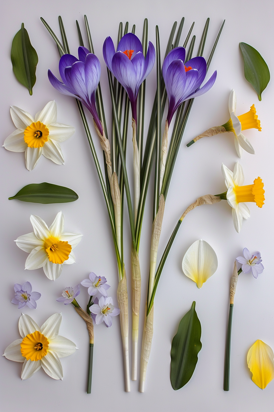 $ A highly detailed, photorealistic botanical photograph of a complex flat-lay spring floral arrangement, arranged as a meticulously placed collection of various spring blooms, exactly matching image_30.png. The scene is centered around a tall cluster of three large, purple-blue crocus flowers (with distinct yellow stamens and delicate petals) and four larger white and yellow daffodils, with long green leaves, all stemming from the center. Surrounding this central cluster are multiple individual flowers: four large, distinct daffodils (three with white petals and yellow cups, one fully yellow) positioned left, right, and bottom-left and bottom-right; a fifth slightly smaller white and yellow daffodil; two smaller stems with delicate purple wildflowers; and several detached green leaves. A single small, detached yellow crocus petal is also included. Intricate, realistic petal textures and detailed stamen definitions on all flowers. Fine venation on all petals. Crisp green leaves with precise edges. Crystalline clarity across the entire plant system. Completely isolated on a clean, solid, extremely pale, cool neutral grayish-white background, matching previous examples. Flat, even, soft studio diffused lighting, illuminating the intricate arrangement with no harsh shadows or highlights, emphasizing petal translucency. Crystal clear, edge-to-edge sharp focus across all flowers, petals, stamens, and stem details. Pristine botanical photography, high-end macro details, 8k resolution, ultra-realistic --no low resolution, noise, artifacts, blur, bokeh, motion blur, distorted shapes, abstract, paper texture, vase, pot, dirt, environment shadows, reflections, gloss, shiny, plastic, metallic, glare, artificial elements, other flower species, insects, water drops, depth of field, non-macro details --ar 2:3 --stylize 100 --v 6.0 --style raw