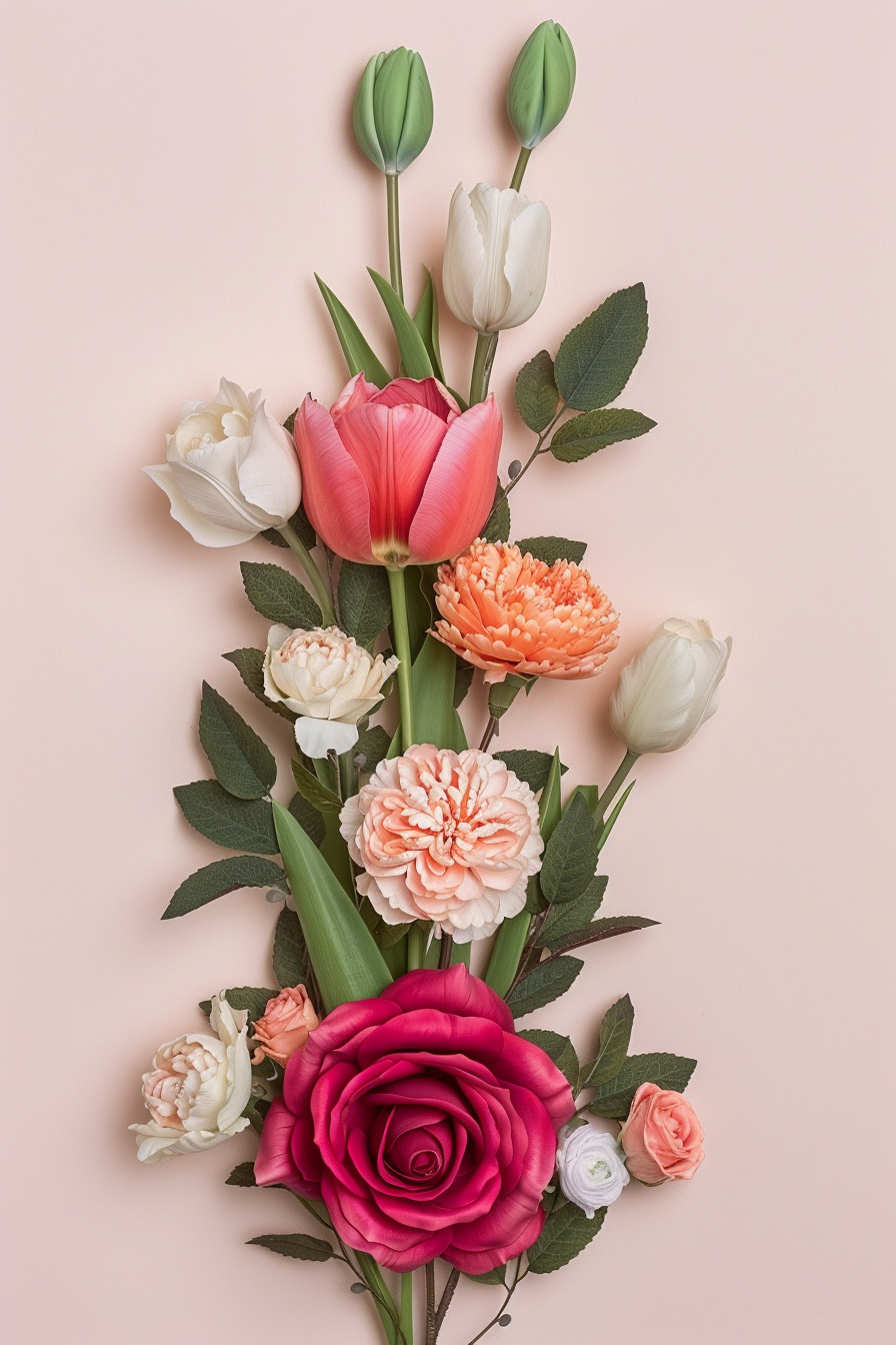 $ A highly detailed, photorealistic botanical photograph of a vertical, cascading bouquet, composed of exactly the specific arrangement of flowers and greenery seen in image_3.png. The vertical composition features a harmonious blend of multiple flower types, including: two large, fully open, vibrant fuchsia-pink rose blooms at the lower-left and center-right; one dusty rose-mauve rose head; four bi-color white and pink tulips (one prominent one and three smaller ones above); clustered coral-peach double carnations in the center; and scattered delicate small pink and white waxflowers and small ranunculus. The collection is arranged on slender green stems with graceful, sharp-pointed green leaves (ruscus and tulip-like leaves) and several delicate green closed tulip and rose buds at the top. Each individual bloom, petal, stamen, stem, and leaf detail is rendered with intricate, crystal-clear textures and natural details. The entire object is completely isolated on a solid, clean, extremely pale, cool pinkish-white background, matching the isolation from previous examples (like image_11.png and image_12.png). Flat, even, soft studio diffused lighting illuminates the cascading arrangement with no harsh shadows or highlights, emphasizing petal translucency. Crystal clear, edge-to-edge sharp focus across all flowers and foliage. Pristine botanical photography, high-end macro details, 8k resolution, ultra-realistic --no vase, pot, dirt, background shadows, environment, chaotic dense placement, motion blur, bokeh, gloss, shine, reflections, plastic, metallic, glare, abstract forms, water drops, insects, paper texture, blurred background, low resolution, noise, artifacts, garden setting --style raw --v 6.0 --ar 2:3 --stylize 100