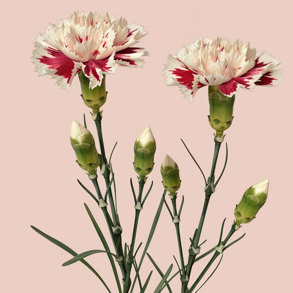 $ A highly detailed, photorealistic botanical photograph of multiple stems of miniature carnations, identical in composition, variety, and positioning to image_20.png. The scene features two fully open, textured bi-color miniature carnation blooms on long, thin, branching green stems. The blooms have pale creamy-pink bases with sharp, fringed deep crimson-magenta edges. Also present are seven closed green buds, one prominent partly open creamy-pink bud with a visible central stripe, and multiple long, slender, pointed green leaves, exactly as arranged in image_20.png. Every single petal, bud, leaf, stem, and all the intricate, textured ruffles and the specific color markings are rendered with intricate, realistic clarity and sharp focus. The entire complex object of multiple stems, flowers, and leaves is completely isolated on a solid, clean, extremely pale, cool pinkish-white background, matching the background tone from previous examples like image_11.png and image_12.png. Flat, even, soft studio diffused lighting illuminates the entire arrangement with no harsh shadows or highlights, emphasizing petal translucency and texture. Crystal clear, edge-to-edge sharp focus across all elements: all blooms, all petals, all stems, all leaves, and every single bud. Crystalline clarity across the entire radiating object. Pristine botanical photography, high-end macro details, 8k resolution, ultra-realistic --no gloss, shine, reflections, plastic, metallic, glare, floor reflections, surface shadows, abstract forms, distorted shape, motion blur, blur, depth of field, bokeh, vase, pot, dirt, background shadows, environment, leaves outside the specific elements, paper texture, glass, metallic base, abstract art, water drops, insect, other flower types not listed, out-of-focus elements, artificial elements, low resolution, noise, artifacts --style raw --v 6.0 --ar 1:1 --stylize 100