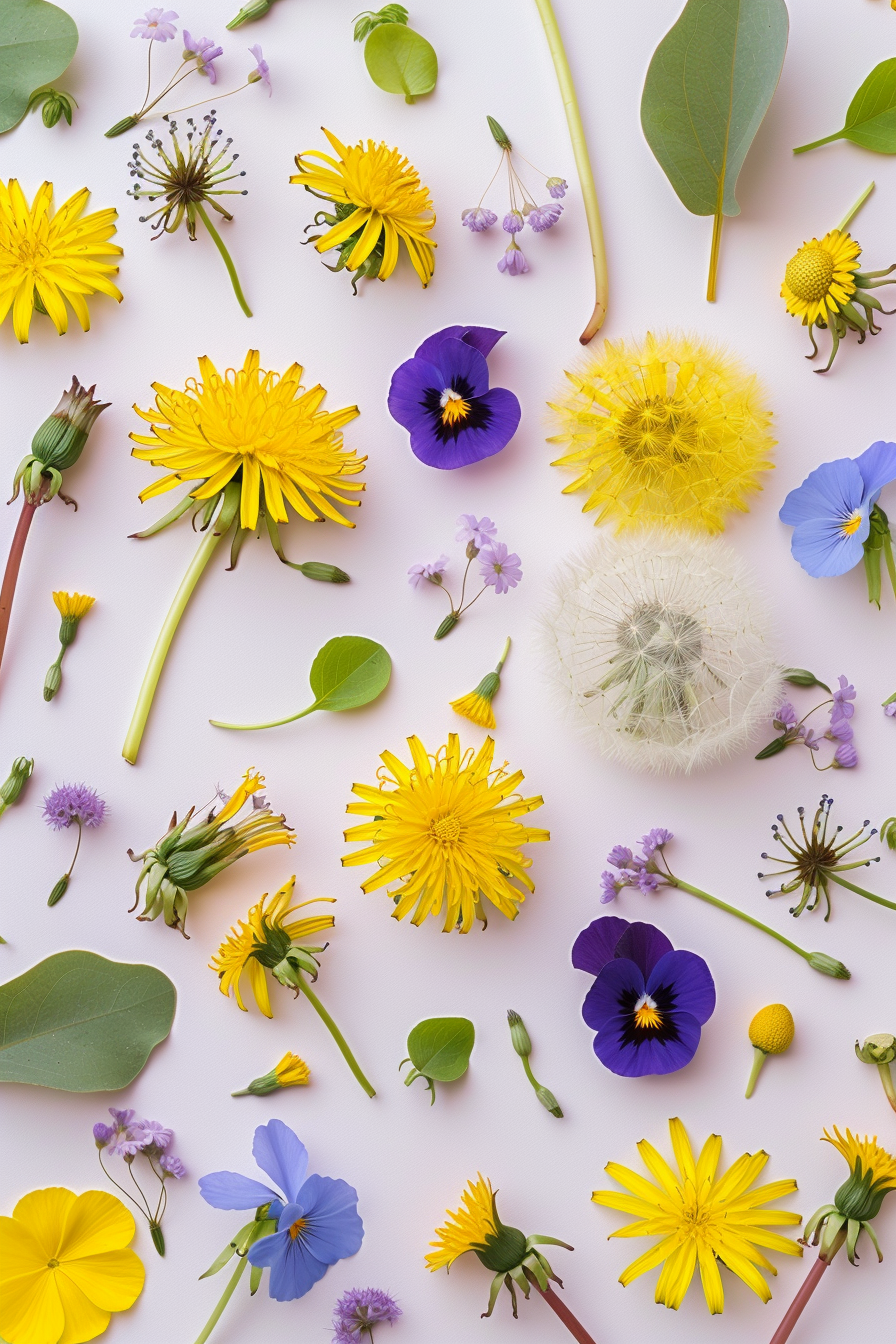 $ A highly detailed, photorealistic botanical flat-lay pattern photograph of a complex, dense, non-repeating scattered arrangement covering the entire frame, composed of numerous individual wildflower blooms, leaves, stems, buds, and seed heads, precisely matching the varied collection in image_4.png. The collection includes multiple large and fully open yellow dandelions (Taraxacum), smaller yellow buttercups, several smaller deep purple and yellow-centered pansies (Viola), delicate blue-violet bellflowers, a prominent fluffy white dandelion puff seed head, complex feathery leaves, heart-shaped leaves, and numerous green buds on long thin stems. Every single element, from the texture of the intricate yellow petals and velvety pansy to the fine details of the leaf veins and delicate seed fluff, is rendered with hyper-realistic texture and crystal clear clarity. The entire arrangement is completely isolated on a solid, clean, extremely pale, cool pinkish-white background. Flat, even, soft studio diffused lighting illuminates the collection with no harsh shadows or highlights, emphasizing petal and leaf translucency. Crystal clear, edge-to-edge sharp focus across all elements. Pristine botanical collection photography, high-end macro details, 8k resolution, ultra-realistic --no gloss, shine, reflections, plastic, metallic, glare, abstract forms, distorted shape, motion blur, blur, depth of field, bokeh, vase, pot, dirt, background shadows, environment, bushy foliage, dense clusters, paper texture, glass, metallic base, abstract art, water drops, insects, other flowers, out-of-focus elements, artificial elements, low resolution, noise, artifacts, garden setting --style raw --v 6.0 --ar 2:3 --stylize 100