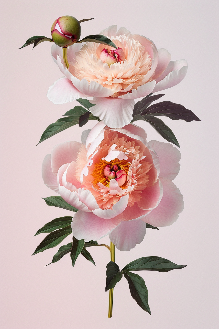 $ A highly detailed, photorealistic botanical photograph of a precisely arranged vertical cascade of exactly three distinct, fully open peony blooms, identical to the composition in image_23.png. Top peony: a large Japanese or anemone-form peony with delicate soft-pink guard petals surrounding a dense, creamy-white center of petaloids with pink tips, as seen in image_23.png. Middle peony: a fully open, bright magenta-pink double peony with visible golden-yellow stamens in its core. Bottom peony: another Japanese or anemone-form peony, similar to the top one but slightly smaller, with soft-pink guard petals and a dense, creamy-white center with pink tips, floating independently below the main cluster, matching image_23.png. Stems and leaves: a network of slender green stems connecting the top two flowers, with dark, pointed green leaves, including the leaf details from image_23.png. Buds: one tightly closed pink bud at the upper-left, and another smaller closed green bud below it, positioned as in image_23.png. The entire floating botanical object is completely isolated on a clean, solid, ultra-pale, neutral pinkish-white background, matching the background tone from previous isolated examples. Even, soft studio diffused lighting, illuminating the arrangement with no harsh shadows or highlights, emphasizing petal translucency and detailed textures. Crystal clear, edge-to-edge sharp focus across all elements: all three blooms, all petals, stamens, buds, stems, and leaf details. Pristine botanical photography, high-end macro details, 8k resolution, ultra-realistic --no other types of flowers, different color flowers, abstract shapes, distorted shapes, motion blur, depth of field, blur, bokeh, vase, pot, dirt, environmental shadows, paper texture, glass, metallic base, water drops, insects, out-of-focus elements, artificial elements, low resolution, noise, artifacts --style raw --v 6.0 --ar 2:3