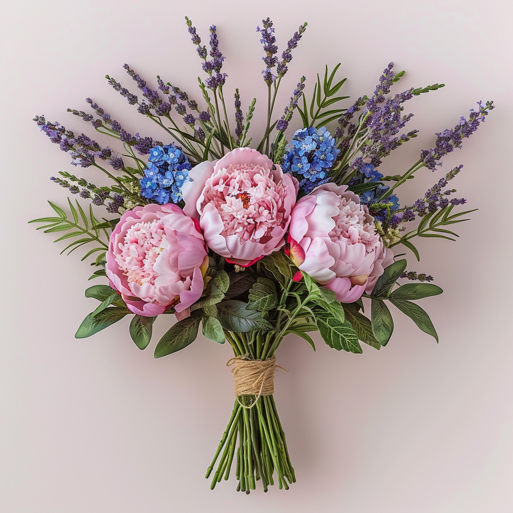 $ A highly detailed, photorealistic botanical photograph of a elaborate and harmonious mixed flower bouquet, identical in composition and structure to image_14.png. The arrangement features exactly four lush, full pink peonies, paired with numerous sprigs of detailed blue lavender, clusters of delicate purple small clover-like flowers, and textured asparagus fern. All blooms and foliage are held together by multiple distinct green stems wrapped neatly at the base with natural jute twine. The colors are vibrant and true-to-life. The entire object is completely isolated on a solid, clean, extremely pale cool pinkish-white background, matching the background pattern from previous examples (like image_13.png). Flat, even, soft studio diffused lighting, illuminating the entire bouquet with no harsh shadows or highlights, emphasizing intricate details and textures. Crystal clear, edge-to-edge sharp focus across all flowers, leaves, stems, and twine wraps. Crystalline clarity across the entire branching object. High-end botanical photography, macro details, 8k resolution, ultra-realistic --no gloss, shine, reflections, plastic, metallic, glare, floor reflections, surface shadows, abstract forms, distorted shape, motion blur, blur, depth of field, bokeh, vase, pot, dirt, background shadows, environment, leaves, paper texture, glass, metallic base, abstract art, water drops, insect, artificial elements, low resolution, noise, artifacts --style raw --v 6.0 --ar 1:1 --stylize 100