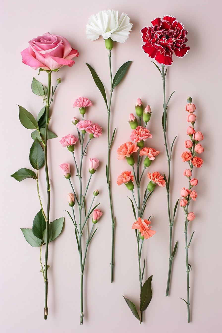 $ A highly detailed, photorealistic botanical photograph of exactly a specific vertical arrangement of multiple individual flower stems and blooms, ordered in distinct columns, covering the entire frame similar to image_2.png. The collection features specific varieties: top-left is a full rose-form Lisianthus in fuchsia-pink, mid-left are clustered small coral-pink Dianthus carnations, lower-left is a large white Lisianthus, lower-mid is a large magenta rose head, mid-right are clustered small coral-pink carnations, far-right top is a deep red-pink rose bloom, and several pale pink Lisianthus buds are mixed in on various long, green stems with leaves. All stems and flowers are positioned vertically with distinct space between them. Each individual bloom is rendered with intricate, crystal-clear petal textures and natural details. The entire collection is completely isolated on a solid, clean, extremely pale, cool pinkish-white background, matching the isolation and background tone from previous examples. Flat, even, soft studio diffused lighting illuminates the arrangement with no harsh shadows or highlights, emphasizing petal translucency. Crystal clear, edge-to-edge sharp focus across all flowers, all stems, and leaf details. Pristine botanical collection photography, high-end macro details, 8k resolution, ultra-realistic. --no gloss, shine, reflections, plastic, metallic, glare, floor reflections, surface shadows, abstract forms, distorted shape, motion blur, blur, depth of field, bokeh, vase, pot, dirt, background shadows, environment, bushy foliage, paper texture, glass, metallic base, abstract art, water drops, insects, other flowers, out-of-focus elements, artificial elements, low resolution, noise, artifacts, garden setting, chaotic dense placement --style raw --v 6.0 --ar 2:3 --stylize 100