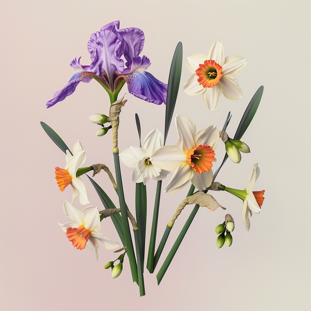 $ A highly detailed, photorealistic botanical photograph of a precisely arranged floating collection of distinct spring flowers, identical to the positioning in image_3.png. The collection features one tall, multi-petal purple and lavender Iris bloom at the upper left. It includes exactly four separate, small white poeticus daffodils with central orange cups, arranged around the main stems. There are three main tall stems: one central stem with a single bright all-yellow daffodil bloom; one right stem bearing two larger white and orange daffodils; one central lower stem with two smaller white daffodils. Several long, slender green leaves and closed green flower buds are included. The entire assembly is completely isolated on a clean, solid, ultra-pale, neutral pinkish-white background, matching the isolation from image_3.png and previous examples. Even, soft studio diffused lighting illuminates the composition with no harsh shadows or highlights, emphasizing petal translucency and intricate vein textures. Crystal clear, edge-to-edge sharp focus across all flowers, petals, stems, and leaf details. Pristine botanical photography, high-end macro details, 8k resolution, ultra-realistic --no gloss, shine, reflections, plastic, metallic, glare, floor reflections, surface shadows, background shadows, environmental context, vase, pot, dirt, abstract forms, distorted shape, motion blur, blur, depth of field, bokeh, glass, metallic base, paper texture, artificial elements, water drops, insects, other flower types, low resolution, noise, artifacts --style raw --v 6.0 --ar 1:1 --stylize 100