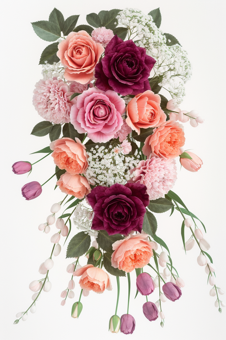 $ A highly detailed, photorealistic botanical photograph of an open, airy, trailing bouquet composition, meticulously arranged with a variety of mixed blooms and foliage, identical to the pattern in image_29.png. The cascade features: at the base center, a vibrant deep magenta-pink rose; above it, a second crimson-pink rose; to the lower-left, a soft pink rose. Trailing upwards are two coral-peach carnations with layered petals. Nestled purple eustoma (Lisianthus) clusters and buds are on the left. Elegant pink-and-white gradient tulips and buds are at the top-center. Long, slender green foliage and delicate sprays of white gypsophila are interwoven throughout. Interspersed individual pink petals and green leaves are scattered around the floating composition. Intricate realistic petal textures and veining on all blooms. The entire floating composition is completely isolated on a solid, clean, extremely pale, cool grayish-white background, matching image_11.png. Flat, even, soft studio diffused lighting with no harsh shadows or highlights, emphasizing translucency. Crystal clear, edge-to-edge sharp focus across all elements. Pristine macro details, 8k resolution, ultra-realistic --no gloss, shine, reflections, plastic, metallic, glare, floor reflections, surface shadows, background shadows, environmental context, vase, pot, dirt, abstract forms, distorted shape, motion blur, blur, depth of field, bokeh, glass, metallic base, paper texture, artificial elements, low resolution, noise, artifacts, insects, other flowers, water drops --style raw --v 6.0 --ar 1:1 --stylize 100