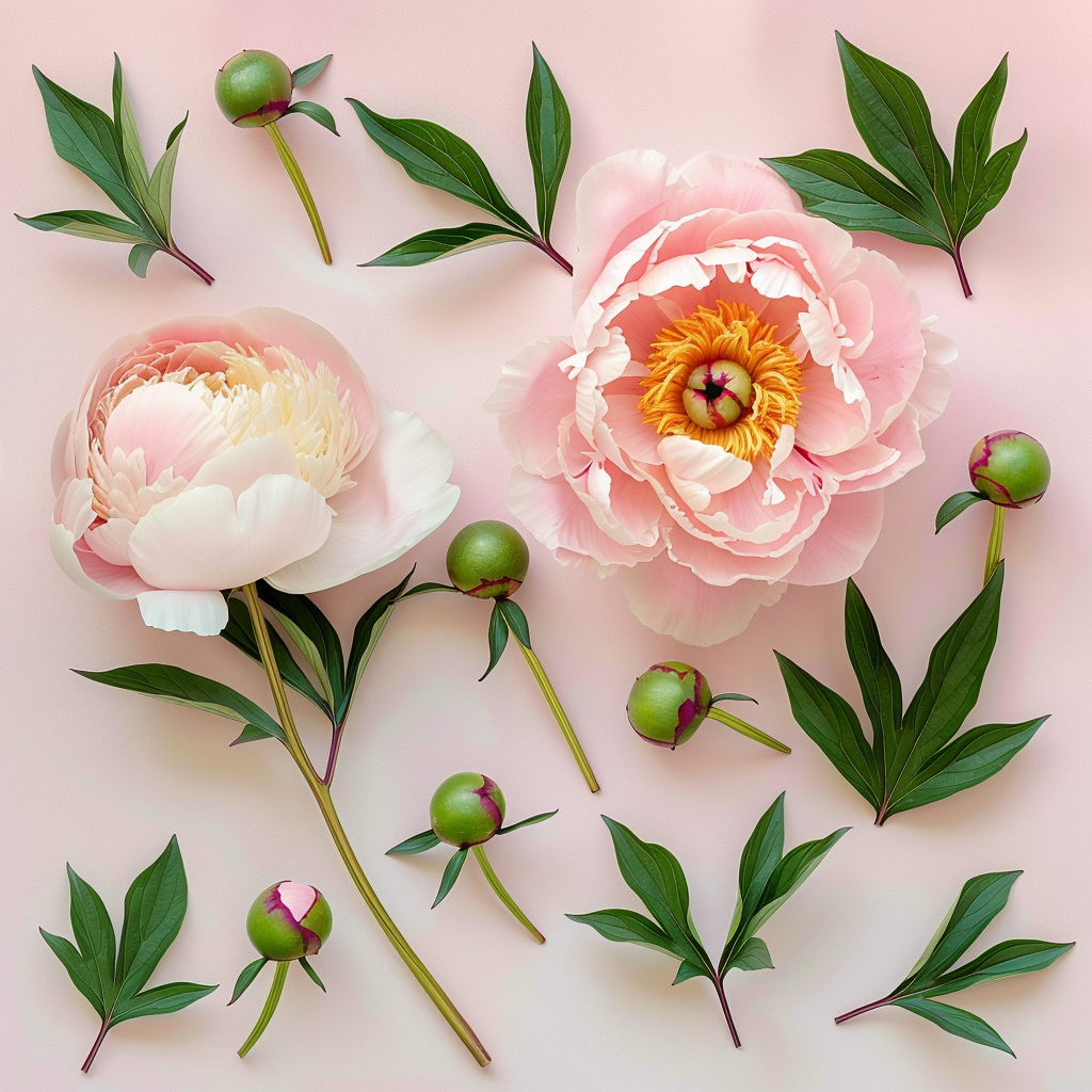 $ A high-end botanical photography, hyper-realistic, 8k resolution, flat lay, or isolated composition on a solid, clean, extremely pale cool pinkish-white background, matching the background pattern from previous examples. The composition is an exquisite botanical flat lay collage featuring exactly three pristine, fully open lush and pillowy soft pink peony blooms with warm peach and cream-colored centers, arranged in different quadrants of the frame. One large, fully formed half-open pink peony bud on a long stem is prominent in the upper left, alongside four varied sizes of closed green-and-pink peony buds scattered throughout on stems. Numerous natural green peony leaves with distinct veining are beautifully arranged as leaves on stems, individual leaves, and a few small floating leaf particles, all interconnected by delicate green stems, creating a cohesive, sprawling botanical pattern. Soft, even, flat, studio diffused lighting, illuminating the entire collection with no harsh shadows or highlights, emphasizing petal and leaf texture translucency. Crystal clear, edge-to-edge sharp focus across all elements: all three blooms, all petals, stamens, all buds, and all stems and leaves. Crystalline clarity across the entire radiating, complex object. Pristine botanical photography, high-end macro details --no gloss, shine, reflections, plastic, metallic, glare, floor reflections, surface shadows, abstract forms, distorted shape, motion blur, blur, depth of field, bokeh, vase, pot, dirt, background shadows, environment, leaves, paper texture, glass, metallic base, abstract art, water drops, insect, other flowers, out-of-focus elements, artificial elements, low resolution, noise, artifacts --style raw --v 6.0 --ar 1:1 --stylize 100