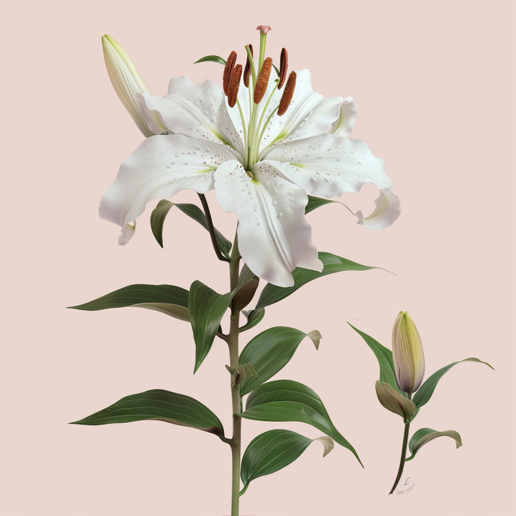 $ A highly detailed, photorealistic branching stem of white Oriental lilies, isolated on a solid, clean, very pale, cool pinkish-white background, matching the isolation. The main central open bloom has pristine white petals with subtle natural veining, showcasing the intricate, curved petal structure and prominent, detailed brown-orange anthers and pistil. To the right on the same branch are a smaller lily bud and a semi-open bloom. The leaves are smooth, vibrant green with visible realistic texture. The branching composition is identical. Flat, even, soft studio diffused lighting, eliminating harsh shadows and highlighting petal translucency. Crystal clear, sharp focus from front to back, edge-to-edge across all petals, stamens, and leaves. Crystalline clarity across the entire branching object. High-end botanical photography, macro details, 8k resolution, ultra-realistic --no gloss, shine, reflections, plastic, metallic, glare, floor reflections, surface shadows, abstract forms, distorted shape, motion blur, blur, depth of field, bokeh, vase, pot, dirt, background shadows, environment, large leaves, paper texture --style raw --v 6.0 --ar 1:1 --stylize 100