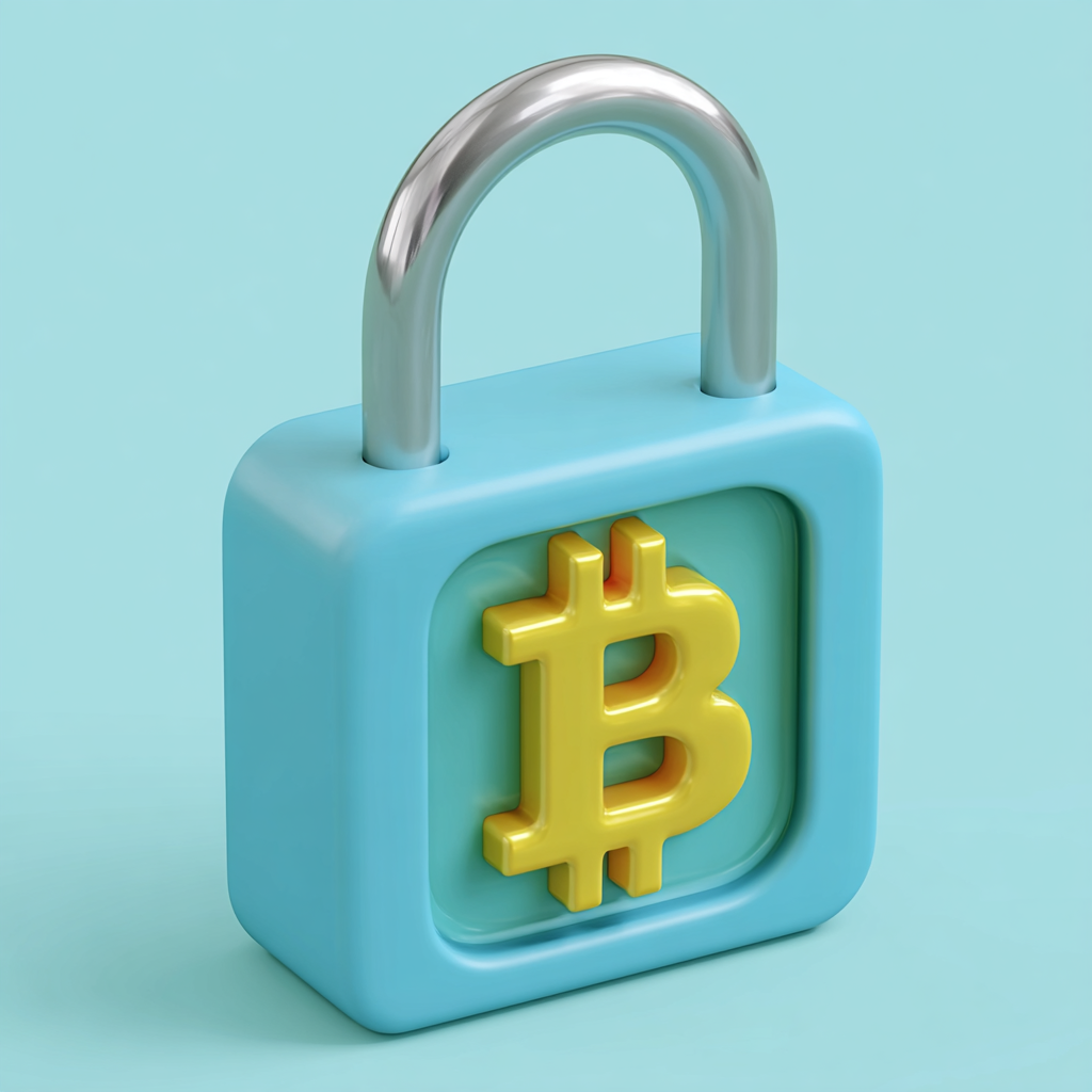 $ A high-quality, professional 3D render icon of a closed padlock. The padlock body is made of vibrant, smooth, soft-textured azure-blue plastic with rounded, plump edges. Centered on the front face of the lock body is a detailed, relief-embossed golden-yellow Bitcoin symbol (₿). The U-shaped shackle is made of smooth, matte metallic silver. The entire lock is shown in a clean isometric perspective, set against a solid, smooth pastel-blue background. Soft, diffused studio lighting highlights the rounded forms, creating gentle, clean shadows. The design is minimalist, clean, and friendly, like a high-end UI icon.